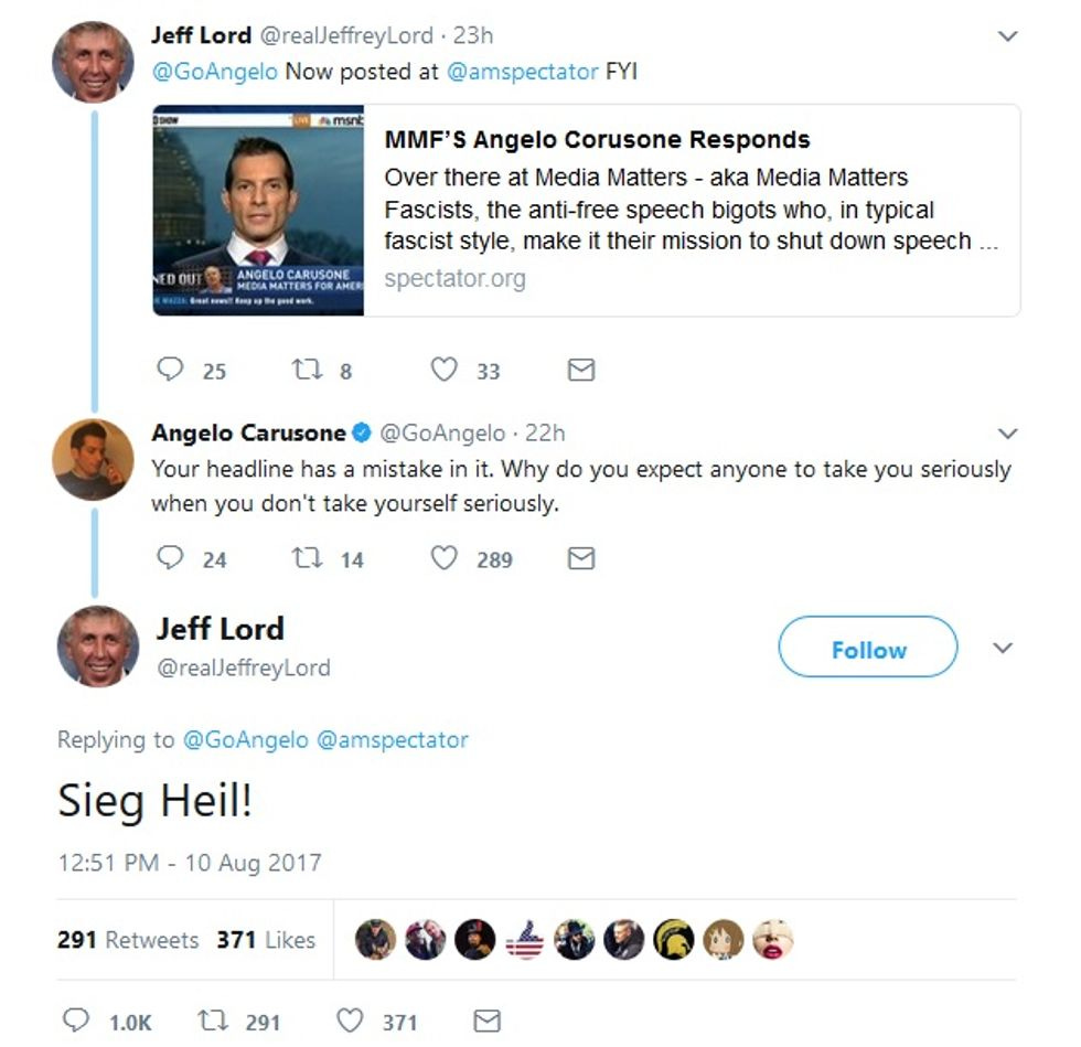 Lord got the boot after a dumb Twitter exchange with Media Matters for America president Angelo Carusone, the target of a recent Lord rant accusing Media Matters of "fascism" for listing Sean Hannity's advertisers. If there's one thing the fascists were notorious for, it was organizing consumer boycotts of those they disapproved of. How well the world remembers Papiernacht, when Hitler's brownshirts published articles suggesting advertisers withdraw their support of Jewish businesses.