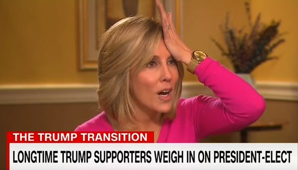Having made one salient point, the original Trump lady takes an express train to Crazy Town, asserting that "Voting is a privilege in this country, and you need to be legal, not like California where three million illegals voted!" At this point, Camerota wants to know where lady got her information, and she responds that it was "coming all across the media!" It was even on CNN, she says! Camerota shakes her head and says "No" very quietly, because bless her heart.