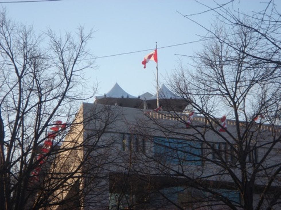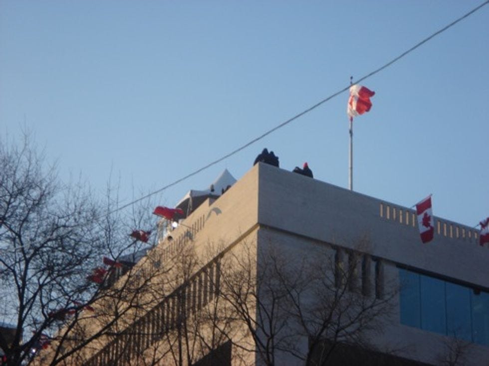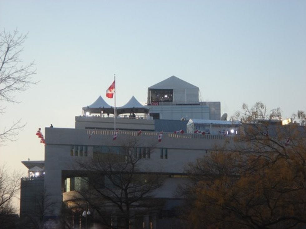 Those of you who were watching your inaugural festivities on the CNN this past week may have wondered from what mile-high fancy pillared balcony America's Best Political News Organization Teevee Team was reporting. Was it the actualMount Olympus,leased out by Obama? No, worse: it was from high atop the Canadian Embassy! They wereactually in Canadato cover the black America party!UPDATE: CNN has e-mailed us to correct certain, HMM, shall we say "untruths" in this post?