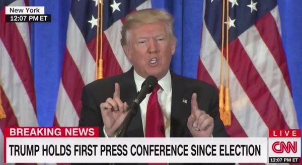 In a surprising turn of events, Donald Trump has decided he loves the media now, all except for CNN and Buzzfeed, which are failing and going out of business because nobody believes they are fake news, obviously. In his presser Wednesday, Trump first dismissed the documents alleging ties between his campaign and the Russian government as "fake news," which of course now means "news I don't like," claimed that "Nazi Germany" would have done something like publishing unverified intelligence reports that were unflattering toward its leader (he may want to brush up on Nazi press policies), and decried Buzzfeed as a "failing pile of garbage.” He then took the opportunity to tell CNN reporter Jim Acosta he was not a real reporter because he is from the fake news network, so sickening he can't even believe it: