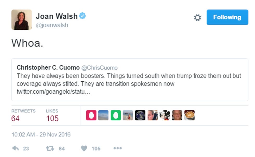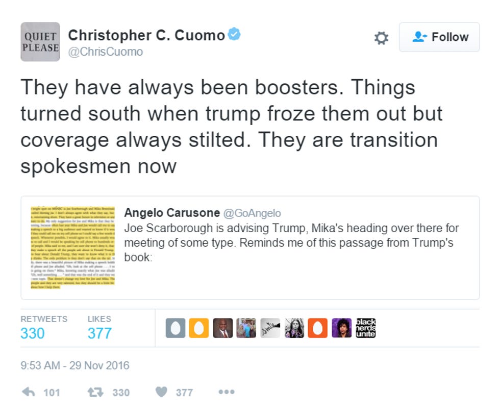 RUH-ROH, there is a media rumble a-brewing, and it is between CNN host Chris Cuomo and those two lovable fuck-birds ( ALLEGEDLY! ) Joe and Mika Scarborough-Brzezinski, what host the "Morning Bone-Zone, With Mika And Joe!" television program on MSNBC! What happened was, according to Mediaite, a media guy called Angelo Carusone tweeted a thing about how it's kinda gross how Joe Scarborough is advising Donald Trump, and just today Mika B. did a meeting at Trump Tower. ( That happened! She was in there for a meeting with Ivanka Trump, SUPPOSEDLY MAYBE, according to CNN's Dylan Byers, but she responded to that charge on Twitter with a solid "that is wrong. Incorrect information. Again." YA BURNT, DYLAN BYERS! AGAIN!)