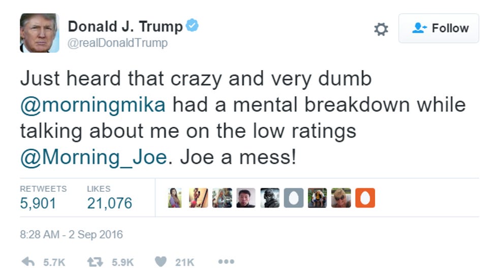 As The Hill points out, there used to be some Taylor Swift/Katy Perry-style Bad Blood between Trump and his little buddies at "Morning Joe," like when they weren't sucking his wing-wang like they are right now. Back when he tweeted things like this: