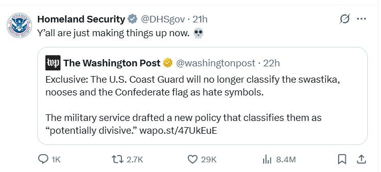 The Department of Homeland Security, which oversees the Coast Guard, responded on X with mockery. As did the department’s assistant secretary for public affairs, whom we already thought about enough this week: