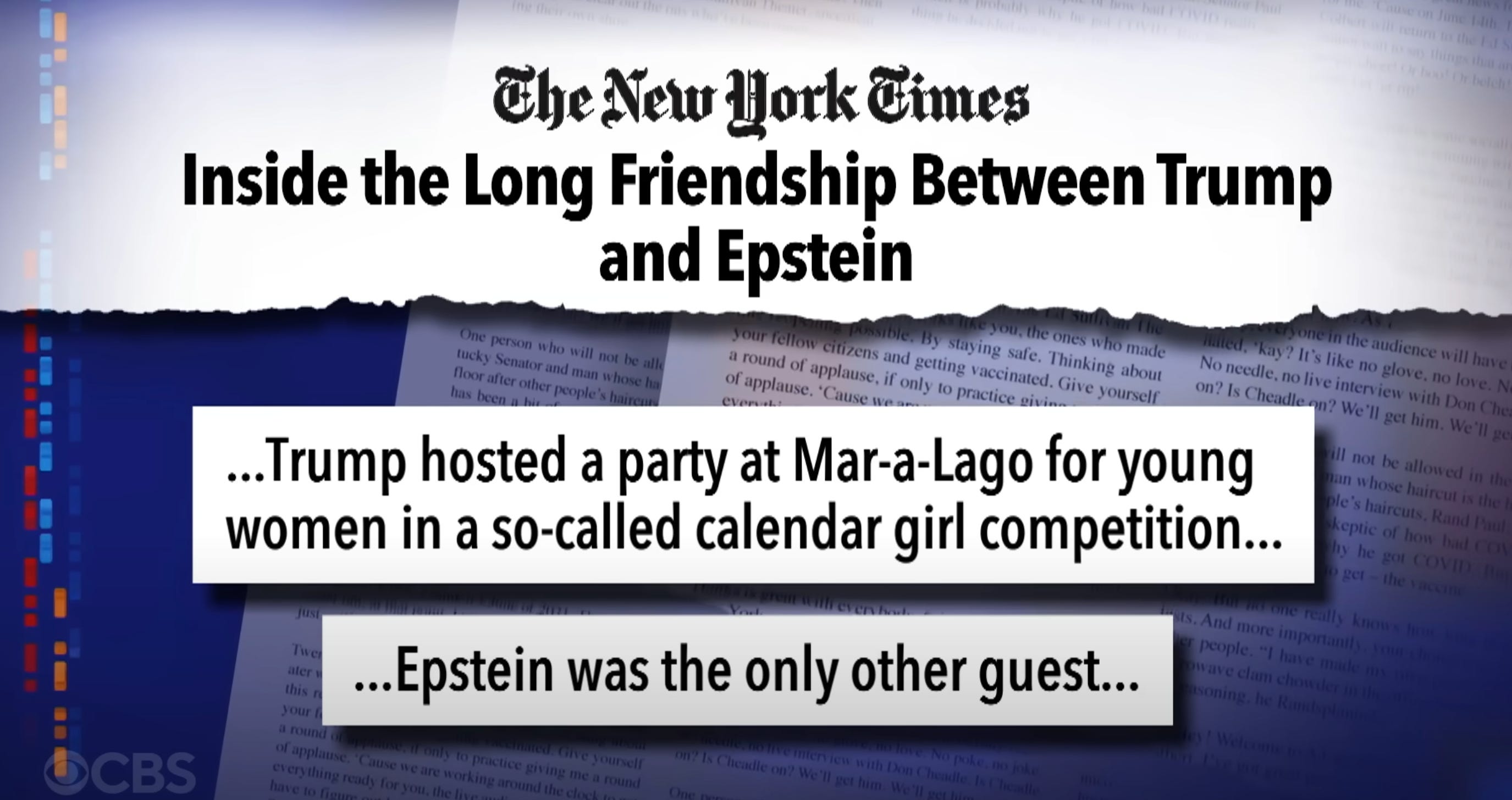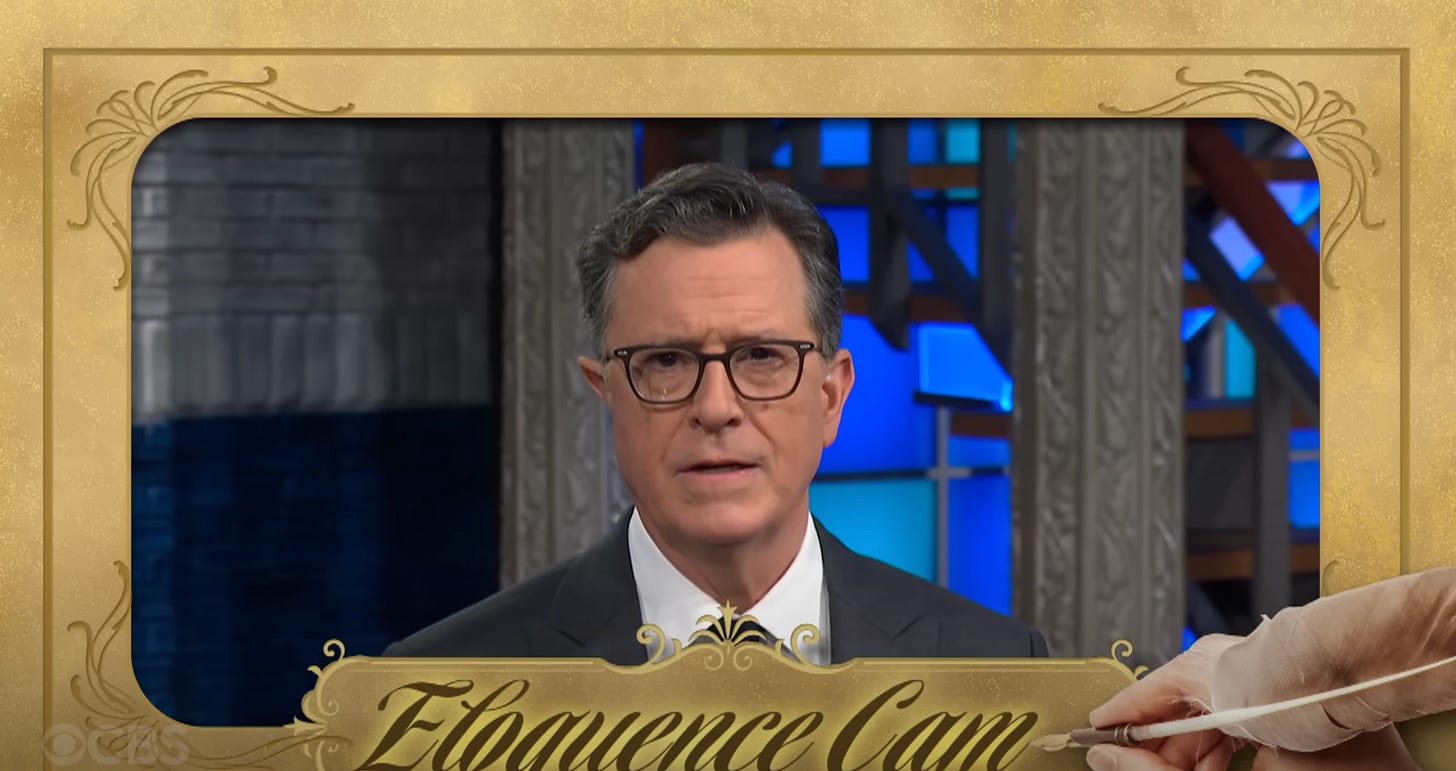 Colbert made fun of that one “party” Trump and Jeffrey Epstein had in 1992, the “calendar girl competition” at Mar-a-Lago where the entirety of the “guest list” was, um, Trump and Jeffrey Epstein.