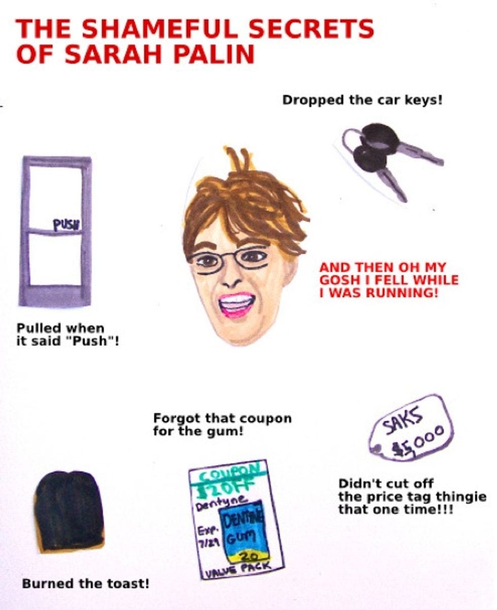 Good news for the Political Arts: Our Chicago pal Lauri Apple is now officially Wonkette's op-art artist-contributor of Fine Political Arts! And here is her delightful chart of Sarah Palin's many, many half-dozen regrets in life. Click for the full-size version, and say hi to Lauri.