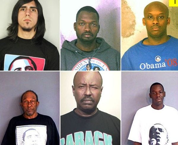 At least you people limit your Barack Obama fetish to tasteful artwork such as this naked Obama upon the Unicorn. But for America's very lousy low-level criminals, there's nothing like some cheap bootleg knockoff YES WE CAN t-shirt to really make a mugshot special. [ The Smoking Gun ]