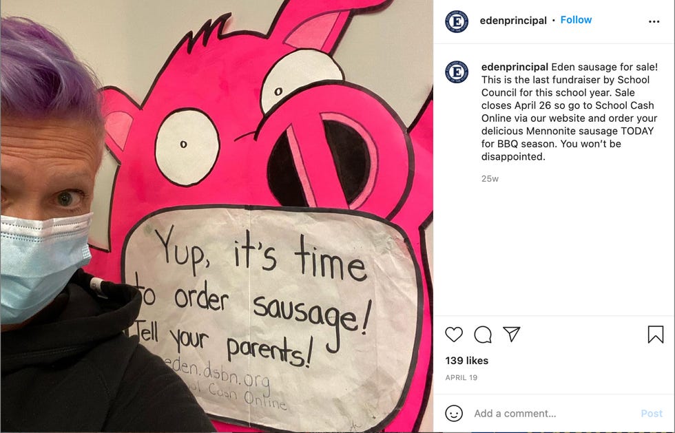 St. Catharines city councillor Karrie Porter told the National Post that she was shocked the story went as viral as it did, saying, "It is funny, silly and frustrating all at the same time." She notes there is probably a lot more to this than just the parents being snippy about a 666 sign. Apparently Sharon Burns is very cool across the board, frequently sports a purple fauxhawk, includes her pronouns on her Instagram page and is otherwise way too cool to be a school principal.