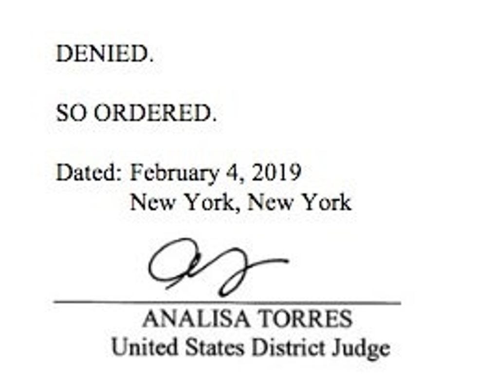 We really like Judge Torres. Here's her response to that request for a delay, in full: