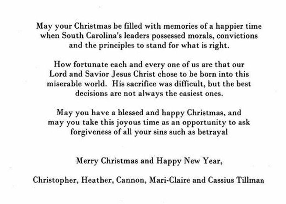 YOU GUYS, AND ALSO LADIES, we have a story for you that is so very, "Oh, what a big surprise, we are so for shocked to hear about this, OH BOY." Just over a year ago, South Carolina and a handful of other Southern states were salving their butthurts over having to remove the Confederate flag, just because a radicalized white supremacist had gunned down nine black church-goers in Charleston, South Carolina. So this one SC lawmakin' good ole boy, state Rep. Chris Corley, sent a Christmas card meant to send a message to all the cuck-servatives (that wasn't a word yet we don't think) who supported the removal of the flag. The card also pined for the good ole days when South Cackalacky lawmakers had some goddang MORALS. You know, the kind of "morals" that keep the Confederate flag flying and subjugate black people. That confederate Christmas message is pictured right here, for your viewing pleasure: