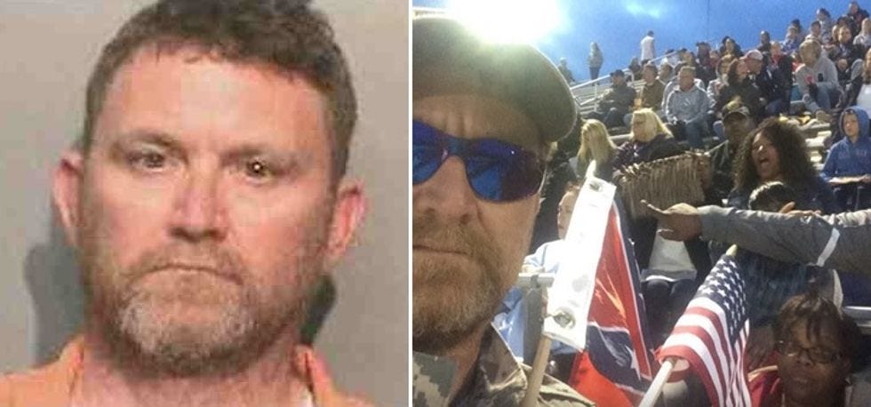 Greene complained to police that he had been assaulted by "African-American people that were behind me" who took his little flags away, although police apparently recovered them. Police told him he'd been ejected for causing a disturbance, and that waving the Confederate flag was in violation of school policy. Poor oppressed Greene kept asking to be allowed back inside the stadium so he could point out the black people he said had assaulted him, but the cops wouldn't let him, since the school had said he wasn't welcome. Poor guy. He explained that he'd come to exercise his Constitutional right to protest the black people who didn't stand for the anthem. A police officer explained,