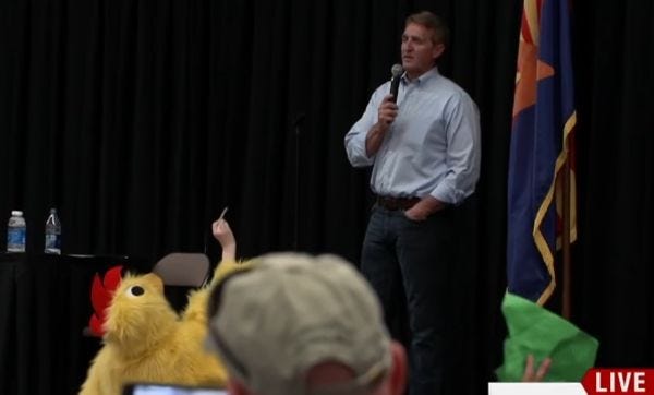 At a raucous town hall in Mesa, Arizona ("raucous" will soon be part of the official title, much like "embattled senator"), Senator Jeff Flake heard again and again from constituents who oppose the not-dead-yet Republican efforts to gut the Affordable Care Act in the name of replacing it. The meeting ran an hour long as Flake, to his credit, stayed around to address the crowd, which was fired up with troublemaking liberal fervor and egged on by a high school kid in a chicken costume who stood in the front row. For all the yelling and chants ("Do your job!" and "shame!" -- we need some new ones), there were even some pretty cogent questions, too: