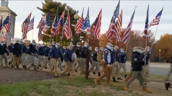 This looks fake to me. Why are their faces covered? Is it because they are FBI agents posing as right-wing extremists? Where are the media interviews so we can see and hear directly from this group?https: //twitter.com/rawsalerts/status/1467260611872669697 …