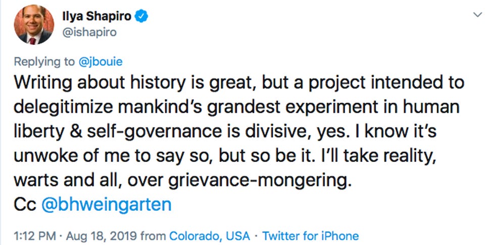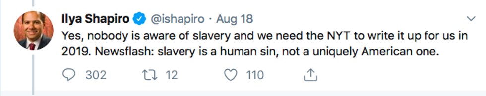 Ilya Shapiro at the Cato Institute scolded New York Times columnist Jamelle Bouie over his interest in history that isn't as benign and politically sanitized as Woody Allen's version of New York.