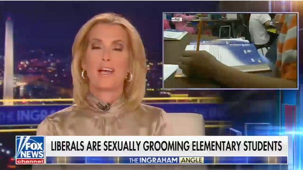 Yes. Teaching kids about consent, according to Laura Ingraham, is grooming. Teaching them about gender is "grooming." It's just so much better if gay and trans kids think there's something unspeakably wrong with them. It's also so much better for kids to find out that gay and trans people exist later, so that they are properly shocked when they find out, instead of just treating it like it's normal all along the way. It's really the only way that people like Laura Ingraham will have anyone to agree with them left in 20 years.