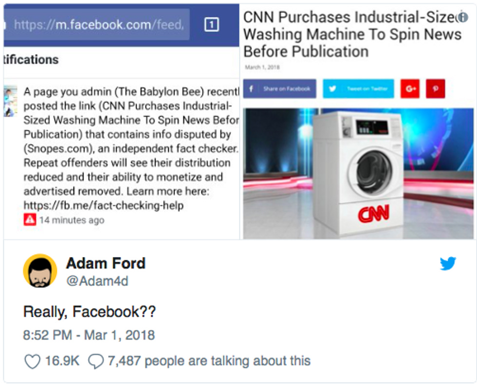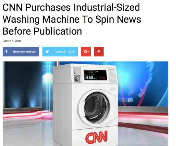 On Thursday, a Christian "humor" site called The Babylon Bee published an article titled “CNN Purchases Industrial-Sized Washing Machine To Spin News Before Publication.” When the clearly satirical (though not in the funny way) article showed up in people's newsfeeds, they were pointed to a Snopes article debunking the post, and the owners of the site were issued a warning that their page could be demonetized for publishing "fake news."