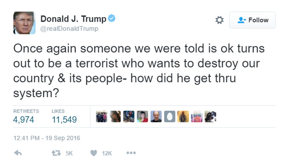 Unless we are being unfair to poor Trump. Maybe he knows those cops did an OK job, but if they weren't such PC pussies right now (THANKS OBAMA), they would have arrested the dude for having an Islamic name and brown skin, LONG before he was the prime suspect in a bombing. MAYBE if President Trump was in charge, the authorities could have deported Rahami back to Afghanistan -- even though he is an American citizen -- along with the millions of peace-loving Muslims and others Trump finds icky, scary and bad, then none of this would have happened.