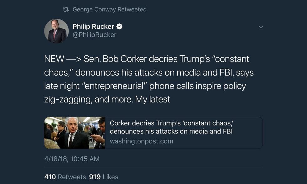To Corker, Marsha Blackburn is the “Nominee That Shall Not Be Named.” But while it's okay to laugh at Corker’s level of petty and Blackburn’s unlikability, note that Corker is telling constituents they should vote for her because SHE WILL vote for Mitch Motherfucking McConnell! So … the sales pitch is “Vote for this Crazy Wingnut because she will vote for the ‘amazing leadership’ of Mitch McConnell”?? You know, the reason the Senate does not work and Mueller can be fired any second? THAT Mitch McConnell?! I’ve seen better choices in SAW movies.