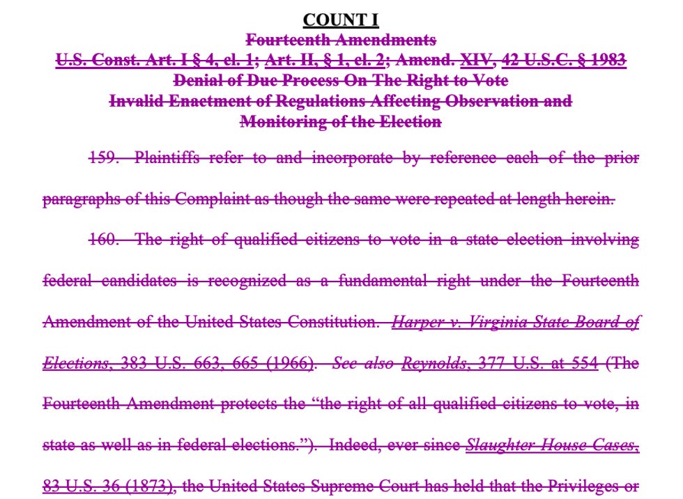 Apparently, this court requires amendments to be submitted with edit-tracking, so you can see exactly how the complaint was modified . Counts I, II, III, VI and VII are all stricken, leaving only the bit about it being NO FAIR! for voters in Philly to be able to cast a provisional ballot if they forgot to sign their mail-in vote.