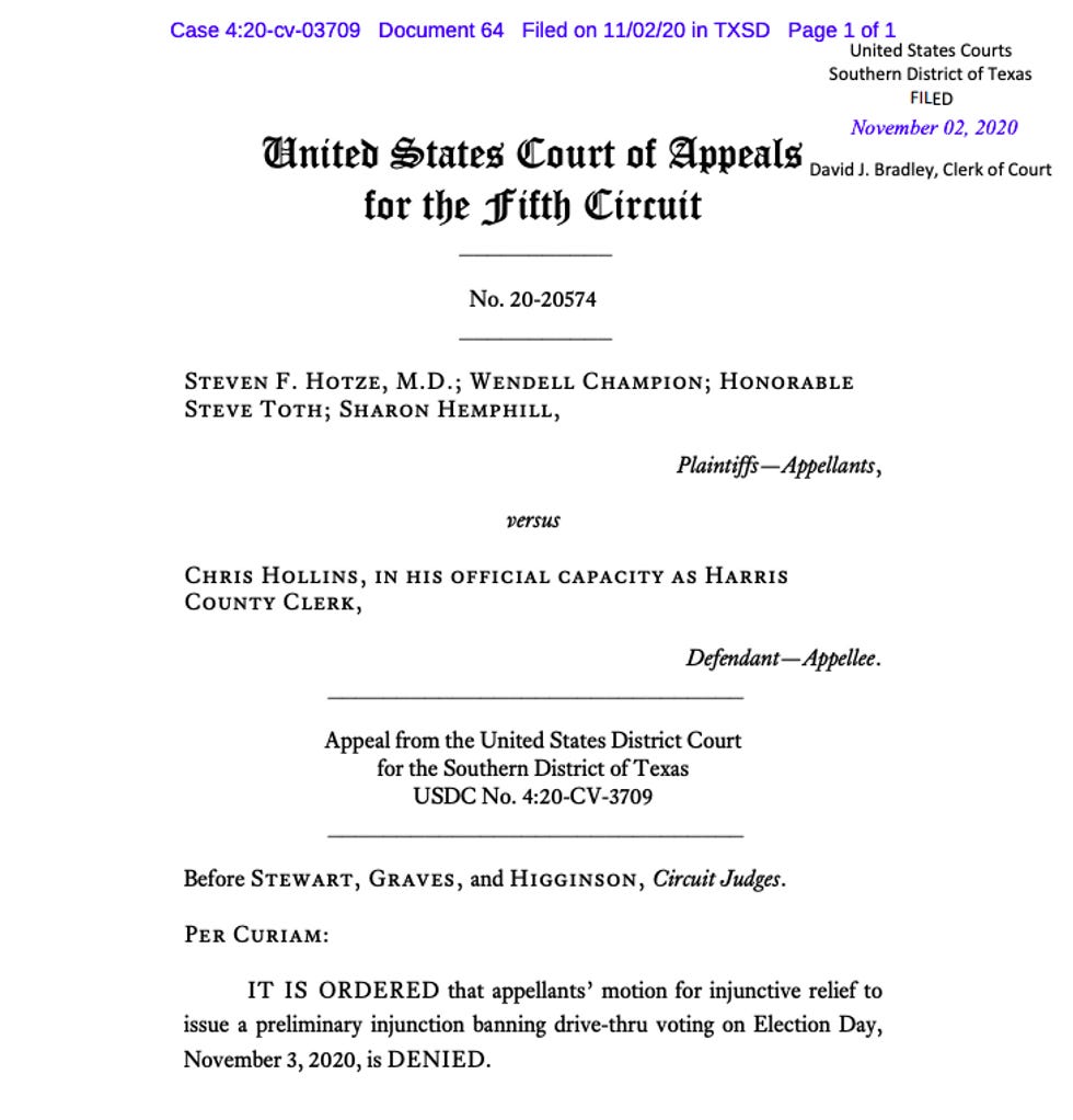 Here's a nice start to Election Day for you. That Texas case where the wingnuts sued to get 127,000 already-cast ballots in Harris County tossed out faced some rough Texas justice from not one but two courts yesterday. As Jamie lawsplained at you Monday, the Hotze v. Hollins plaintiffs argued that votes cast in drive-through polling stations were somehow illegal, even though those stations use the same machines as "indoor" polling stations, it worked fine in the primary, the plan was approved months ago by a bipartisan commission, and Texas's all-Republican Supreme Court said it didn't violate state law.