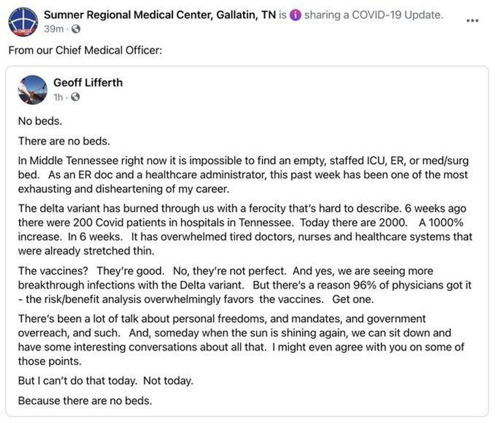 The delta variant has burned through us with a ferocity that's hard to describe. 6 weeks ago there were 200 Covid patients in hospitals in Tennessee. Today there are 2000. A 1000% increase. In 6 weeks. It has overwhelmed tired doctors, nurses and healthcare systems that were already stretched thin.