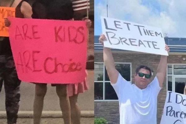 Angry parents demonstrated Wednesday against the mask mandate outside the Pulaski County Board of Education in nearby Somerset; that protest is where the signs up top apparently came from. One upset parent, Ryan Dale, told the Somerset Commerce Journal, "We're not going to stand for it. [...] My words are, my kids will not be controlled by a lesser man than me."