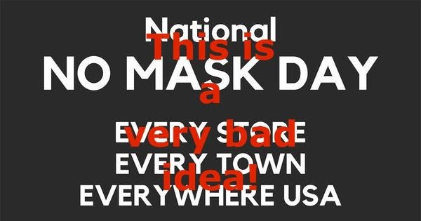 So, naturally, morons across the country are celebrating "No Mask Day" and asking people not only to go out without a mask, but for all stores, cities and towns to end their mask orders so that Republicans can spread the virus to their heart's content. For some reason they are all super jazzed to contract the virus, perhaps in hopes of getting to try that exciting hydroxycholorquine stuff?
