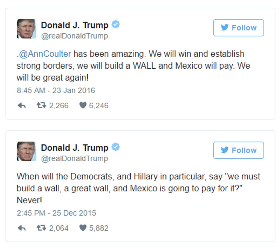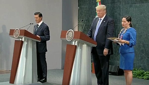 Trump spoke about the dangers of drug trafficking, which we are sure the Mexicans present had never heard about. He said a lot of yadda yadda about his views on trade, which are different from Mexico's views, but that's OK, because the whole point of this is that Trump is going to build a wall to keep the drug traffickers out and Make America Great Again by making deals, so many deals, great deals, tremendous deals, to make trade with Mexico better, and Mexico is going to pay for that wall, right? Trump said that in his Mexico press conference, right? LOL no, he most certainly did not .