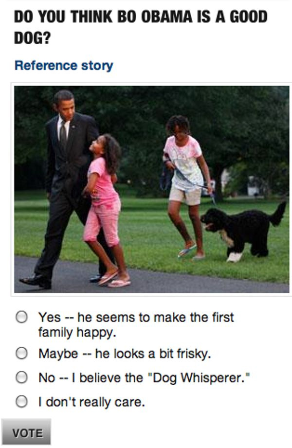 Important news! According to Politico , Obama has a relative named "Bo Obama" who — no, wait, they're talking about that fucking dog. Never mind. This publication put two whole reporters to work tracking down that dog's trainer, because they are a newspaper that concerns itself with governmental affairs. And they called this article "THE REAL BO OBAMA," as it's important for journalists to look into the backgrounds of those who serve in our government as animals who shit on the White House lawn. How big is this story? Politico 's featured poll on their website asks, "Do you think Bo Obama is a good dog?" That is the question we are all asking ourselves less than two weeks before the midterm elections.