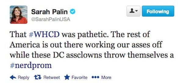 Grifter quitter slob Sarah Palin made her own White House Correspondents Dinner joke, guys! We are going to be optimistic and speculate that she has evolved to a new level of self-awareness. Why else would she be joking about how hard "our asses" are working when everyone knows Sarah Palin doesn't have a job?