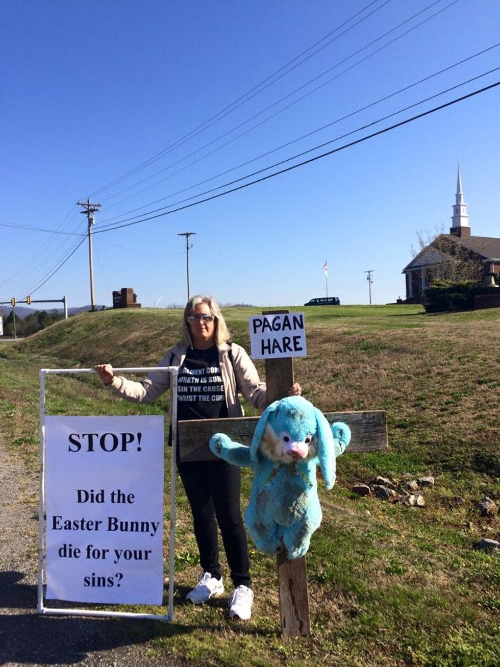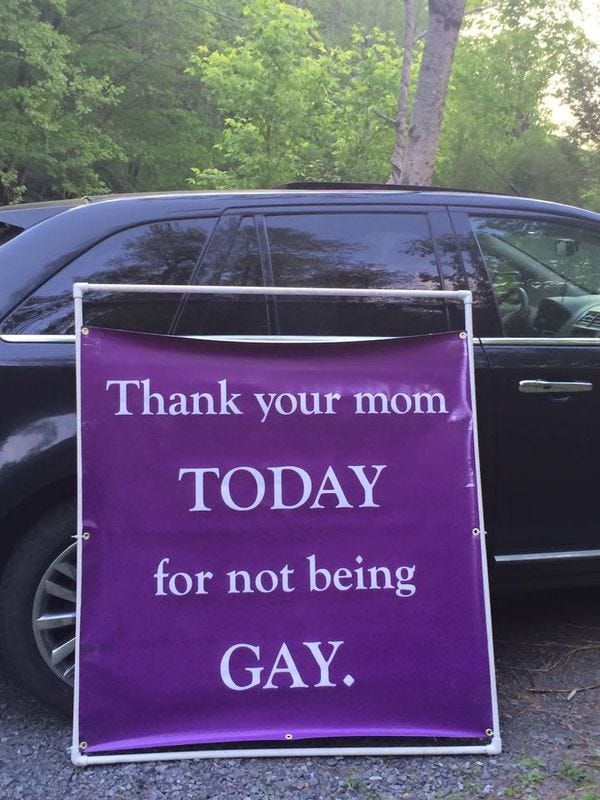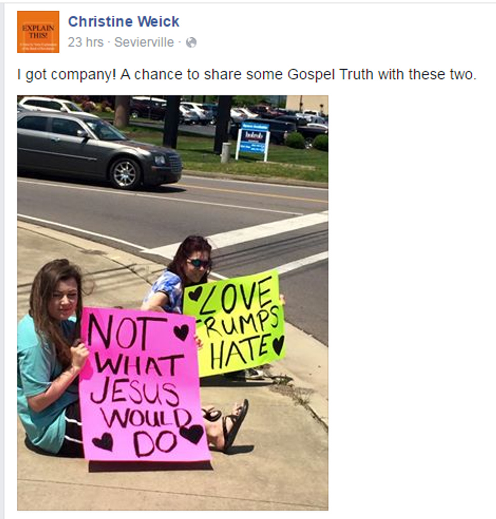So anyway, this is Christine Weick's Mother's Day tradition, apparently. In 2014, she held her "Praise Jesus your mom isn't a lady-loving diddle-monster" sign and another lady threw a slushie at her! This year, she reports that there was no slushie-throwing, but that the EconoLodge staff wanted to turn the garden hose on her, which is LOL. But it turned out OK because they called the cops, and the nice officer said it was perfectly acceptable and legal for her to stand where she was standing, reminding people to reflect on that time their moms' vagina parts were full to the brim of their dads' dicks, because that is the most important part of the fucking Gospels, and if you don't understand such things you are obviously going to hell.
