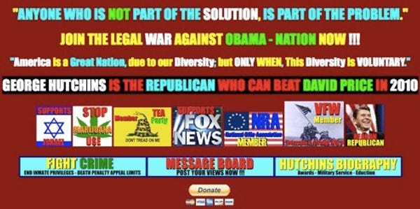 We do not where several tipsters first heard about this website for "George Hutchins," a crazy person supposedly running for a North Carolina congressional seat in 2010, but it is very pretty to be sure. Before loading the page, know that you will have a mere 10 seconds to explore the site before your eyes start cursing at you and eventually melt. We recommend using your limited time to try to make sense of his Sir Walter Raleigh obsession. What is he trying tosay? [ George Hutchins for U.S. Congress 2010 ]