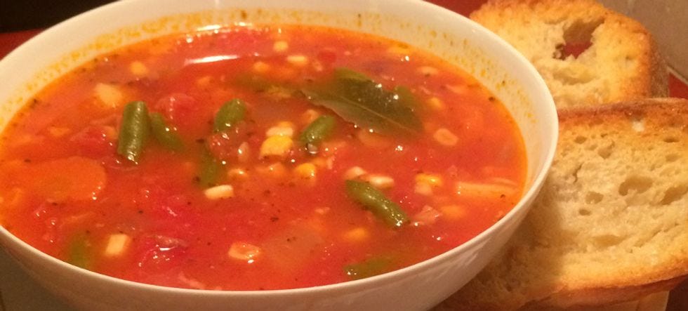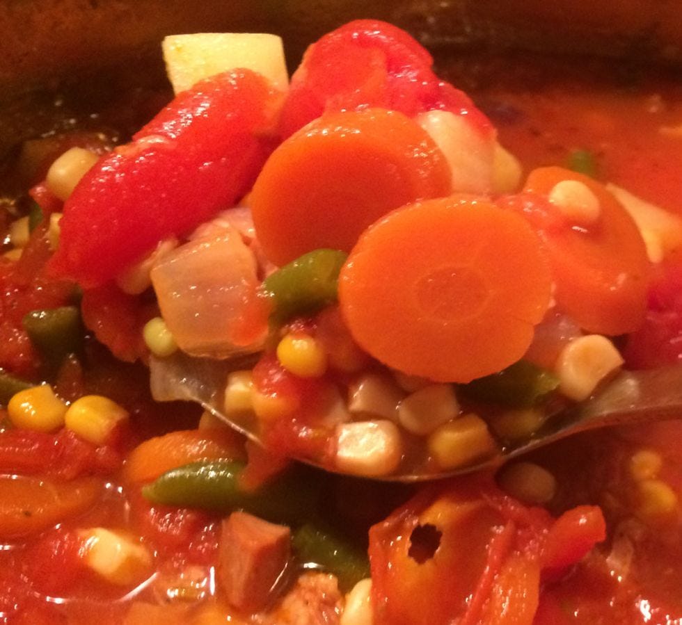 *Opens cans of White and Yellow corn, Carrots and Green Beans* *adds to soup*