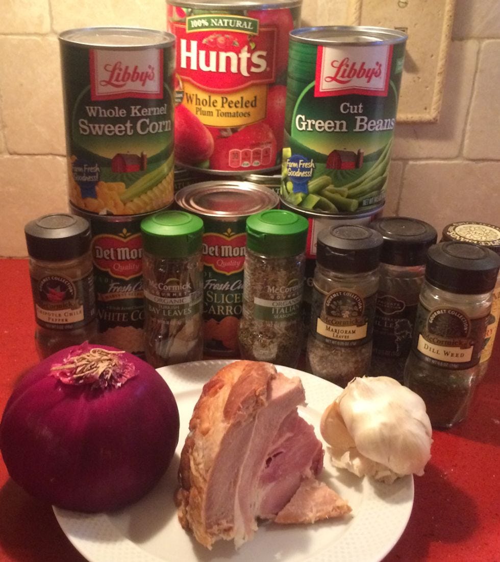Hmmmmm. What else we got? OH hai! How about a nice, meaty hambone? Let's pitch that in there, also too. AND, why not hack up a couple of red potatoes and put them in while we're at it?