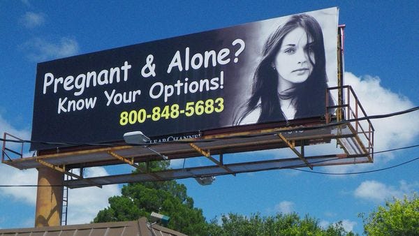 Crisis pregnancy centers are anti-choice institutions that often pretend to be abortion clinics or medical centers in hopes of luring in those seeking an abortion and being able to talk them out of getting one. You know, the ones with the "Pregnant and alone?" or "Pregnant and scared?" advertisement like on the picture above.