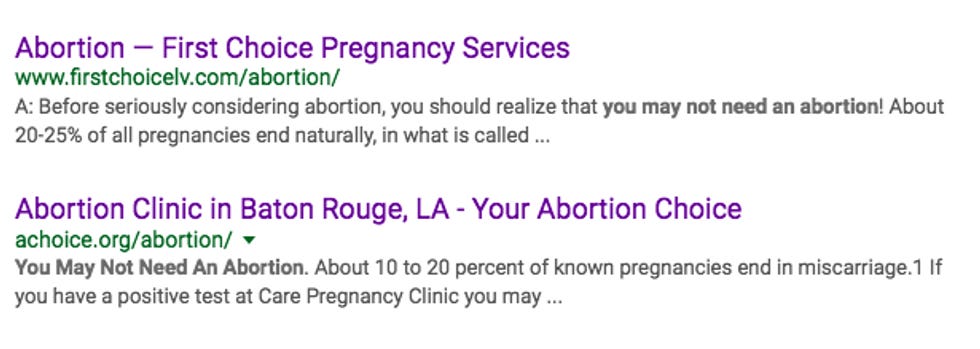 As I mentioned earlier, this is not the only one of these clinics. In fact, a Google search for "You may not need an abortion" turns up nearly 48,000 results, the first few pages all being CPCs like this one, many of them with extremely misleading pro-choicey sounding names like "Informed Choices Clinic" and "RealChoice4Me.com." Several of them have even tailored the way they appear in Google search to make them look like real abortion clinics.