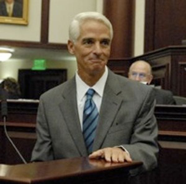This winter season we have been repeatedly disappointed by an assortment of famous people's refusal to run for higher office: Chris Matthews, after flirting outrageously with running for a Pennsylvania Senate seat, seems not to be interested, and ditto former Florida governor Jeb Bush who said he was more interested in "spending time with his family" (Q: gay sex furry pedophile meth-monster scandal brewing?). So which brave soul will step into the fray in 2010 and fill the massive shoes left by outgoing Florida Senator Mel Martinez, who was apparently the Secretary of Housing and Urban Development once? Charlie Crist, that's who! Maybe!