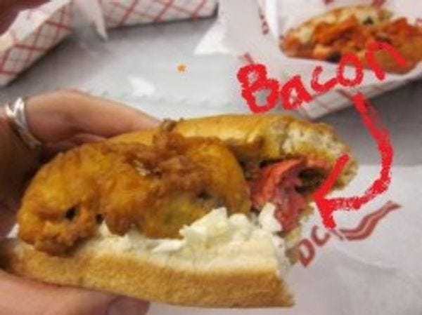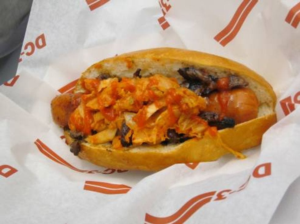 At DC-3 we recommend theSeoul Bulgogi & Kimchihot dog (an Angus beef hot dog in a pretzel roll topped with Bulgogi and pickled Kimchi) for its spice, theBay Bridge Pretzel Dog(an all beef hot dog topped with crab dip and Old Bay), even though they go a bit too heavy on the Old Bay, theCalifornia Left-Winger(a Veggie falafel dog topped with avocado and Tzatziki sauce), because it reminds your Wonkabout of home, and theTuscon Sonoran,because a hot dog wrapped in bacon sounds especially gross/delicious.