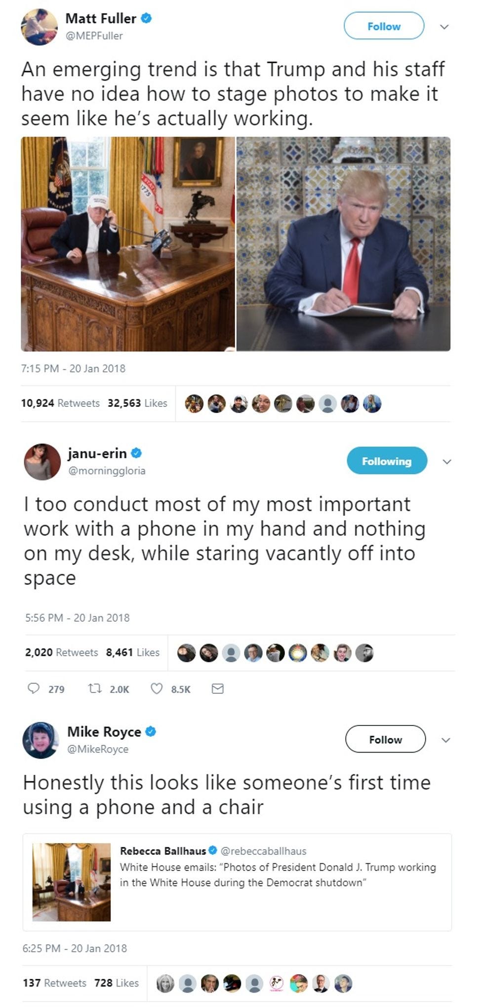 Trump also spent the weekend without getting to golf, which really had to upset him; he was shut away in the White House all weekend and didn't go to his big inauguration anniversary party in Florida. He did at least have an official photographer release a picture of him working very hard for the American People, as one does:
