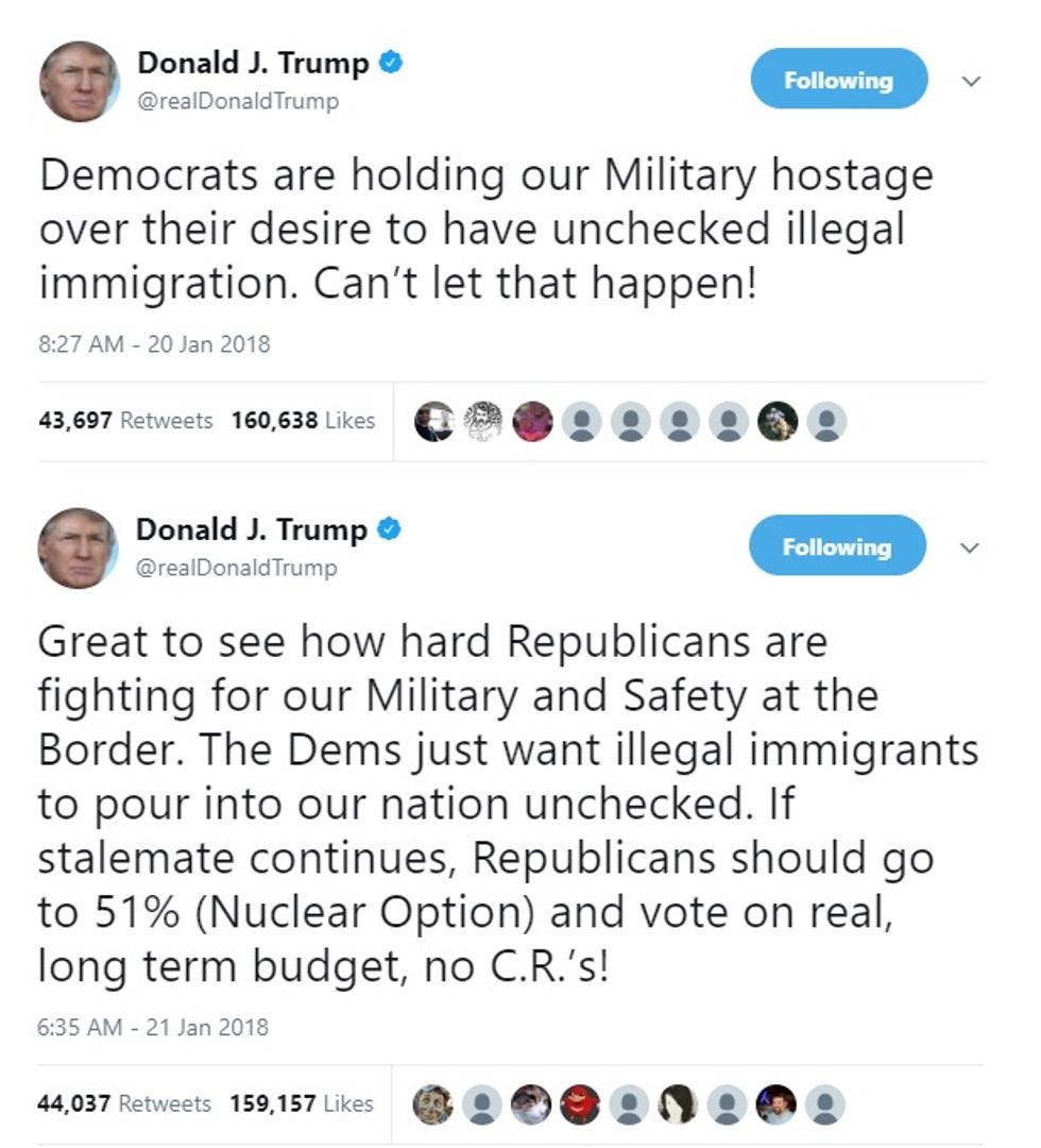 As an indication of just how unwilling they are to deal, top Democrats said over the weekend they'd even be willing to let the big jerk and his phone have some money to play with building a wall, if that would secure a deal on DACA. Schumer said Sunday that when he'd met with Trump Friday before the shutdown, Trump had