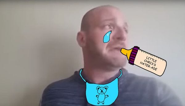 Chris Cantwell, the Crying Nazi, has been banned from Virginia for five years after pleading guilty to two counts of assault and battery. Poor baby.