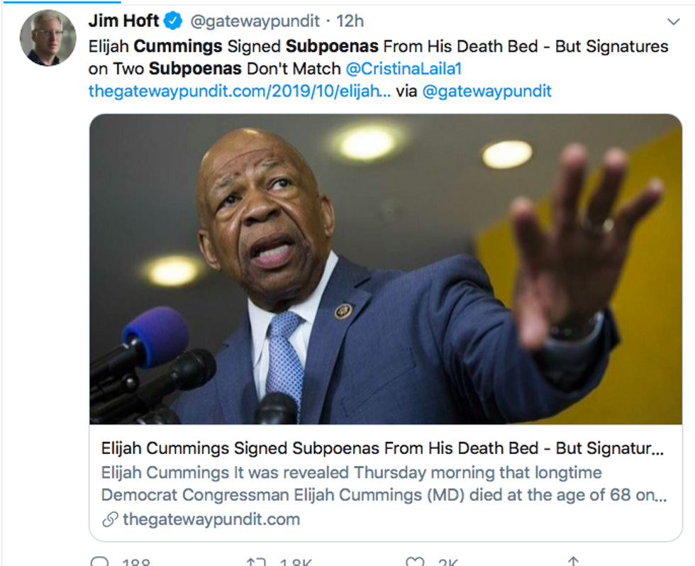 Cummings also signed subpoenas related to Trump's impeachment inquiry from his hospital bed. That's badass. It's probably not how Cummings wanted to spend his last moments. No one should have to think about Donald Trump when they're near death or even in the full bloom of health. But Cummings considered it his duty and his honor to serve America.