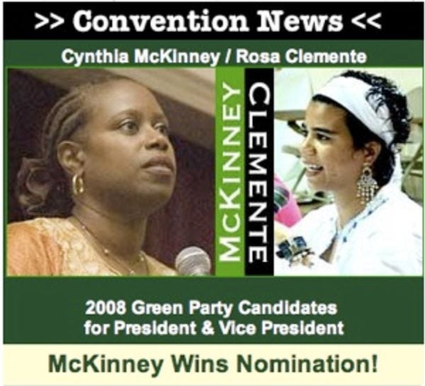 Beloved former congress-lady Cynthia McKinney is the Green Party's presidential candidate! She's in it to win! The Greens had a convention on Saturday, apparently, and McKinney was the big winner. Her running mate is "Rosa Clemente, a hip-hop artist and activist." Well, all right.
