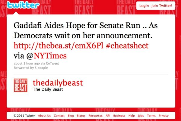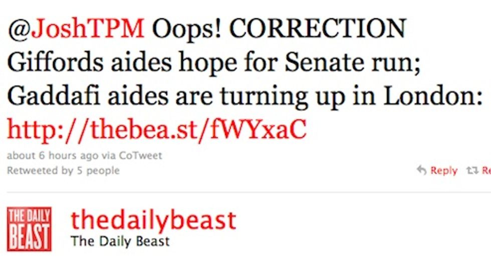 Daily Beast: Arizona Shooting Victim Muammar Gaddafi's Staff Wants 'Her' To Run For SenateJack StuefMar 31, 20112ShareSo much for that new civility. [ Daily Intel ]UPDATE: The correction, which is somehow even worse:Want to just donate once?PreviousNext