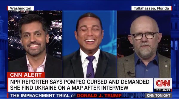 This Never Trumper status lends itself well to CNN appearances, like this one from Saturday in which he, Don Lemon and Wajahat Ali discuss Mike Pompeo's demand that an NPR reporter find Ukraine on a map. This led to Wilson doing a bit about Trump not being able to "find Ukraine on a map if you had the letter 'U' and a picture of an actual, physical crane next to it," which quickly devolved into him making a bunch of jokes about how Trump supporters think maps and reading are for the elites.