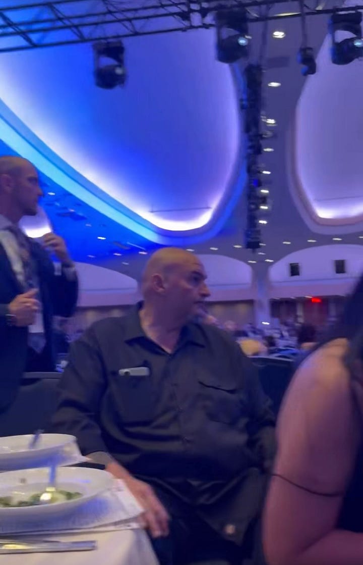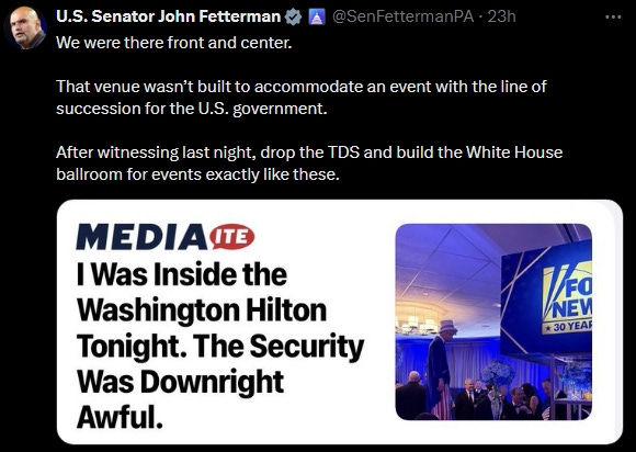 Or the juxtaposition of Pennsylvania Republican Democratic Senator John Fetterman being one of the people asking for said ballroom while being caught calmly relaxing like it was a dinner show during the “harrowing” ordeal…