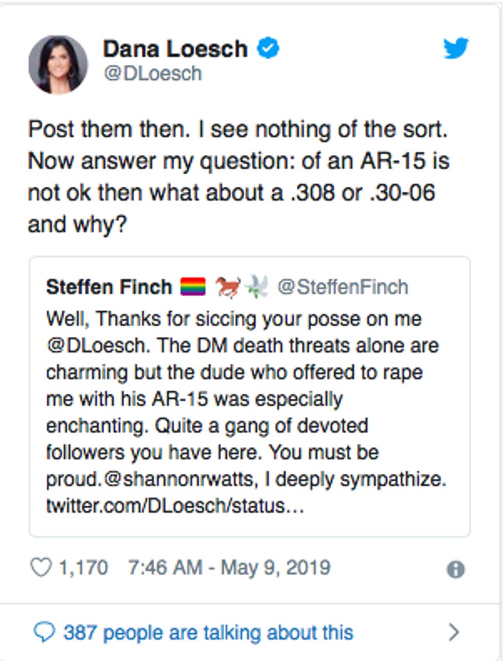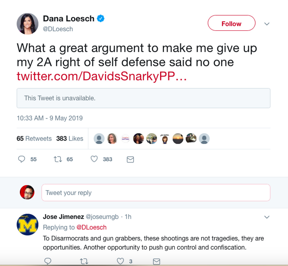 If Ms. Loesch was actually committed to the free exchange of ideas she would: A) Stop making bad faith arguments that ask me to compare a gun with bullet dimensions, B) Stop excoriating those with mental illness while at the same time pretending to "protect" our rights, and C) stop frickin' blocking everyone on social media who asks her about all those millions of Ameros her Russian "friends" are laundering through the NRA.