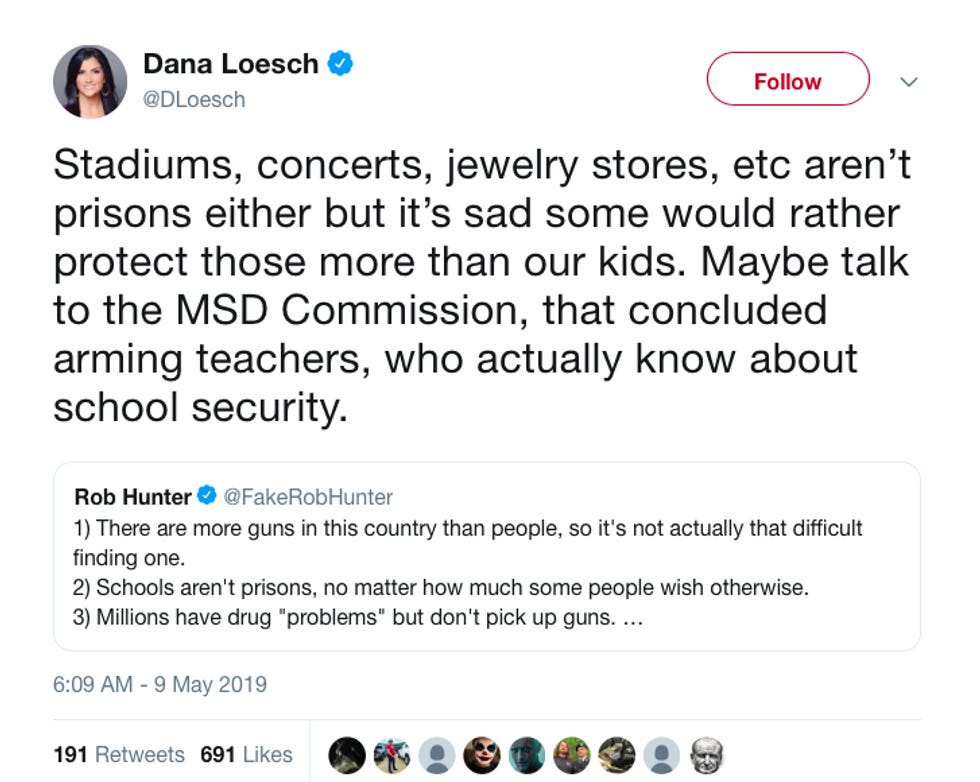 Loesch just wants us to at least consider turning schools into prison-like environments so the people who own her soul can sell more guns. "C'mon, we've already fucked up concerts and most other public places."