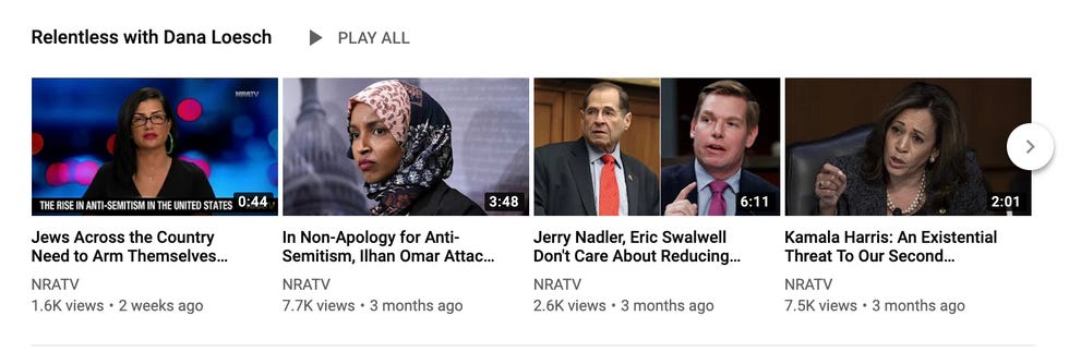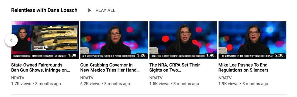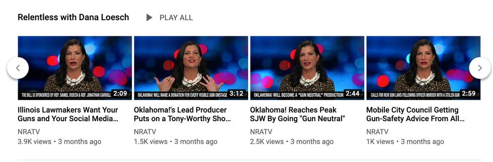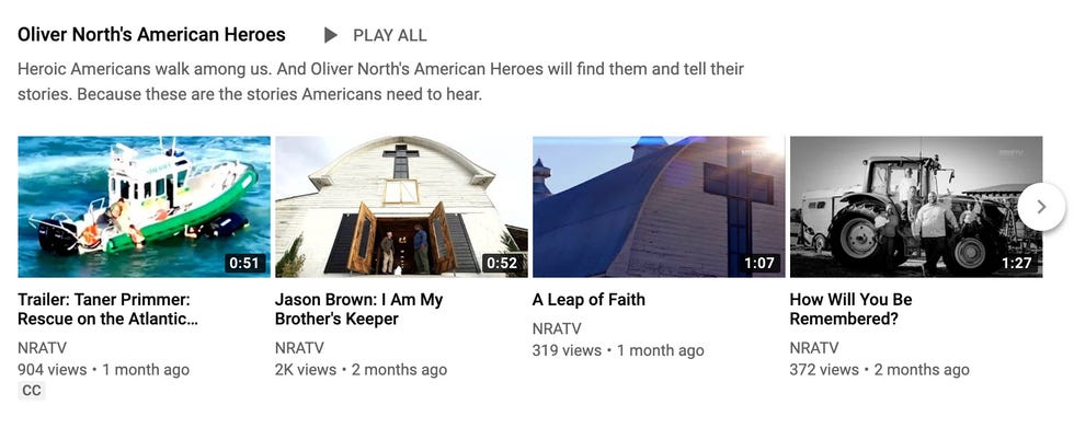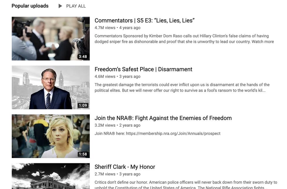 Here's the top of NRA-TV's youtube page. See if you can figure out what NRA ad agency Ackerman McQueen (AMc) is getting paid all the pieces of silver to deliver: