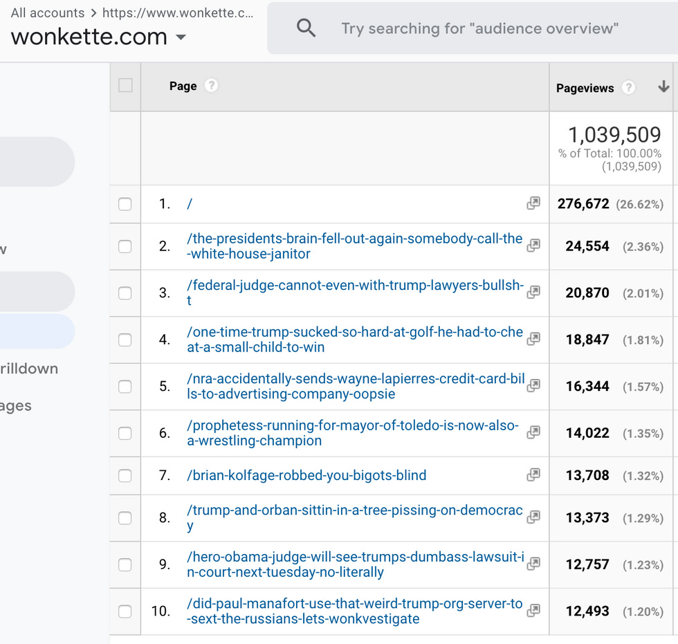 For comparison, here's Wonkette's top 10 stories over the past week -- again, this is with very depressed readership (YOU! You're depressed!) -- and we're not really that big of a website: