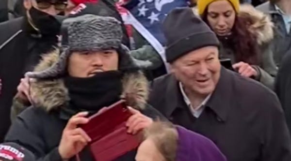 The people who run the Capitol Hunters Twitter account and online clearinghouse of information about the January 6 terrorists spotted Rohrabacher in the crowd, as you can see above. According to the evidence they posted, Rohrabacher was "nearly 500 feet beyond the police barriers and inside the restricted zone, but there is no indication he attempted to climb the West Plaza steps or enter the building." So that's good of him. Of course, he's probably a little bit old balls to be running around doing domestic terrorist activities with the kids.